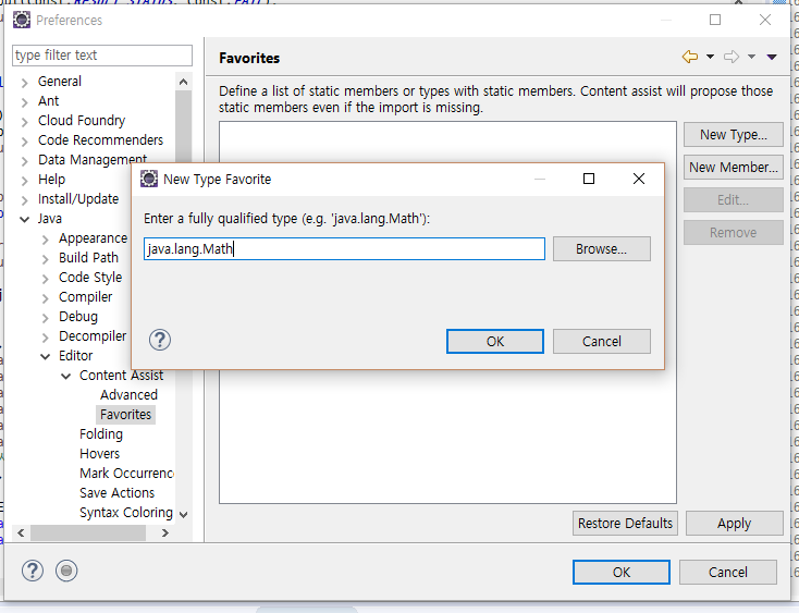 이클립스 자동완성 Ctrl + Space를 누르면 Code Assist가 동작하여 자동완성을 도와주지만, static import는 기본적으로 자동 완성 인식을 하지 못하는데, Favorites에 등록하게되면 Code Assist의 지원을 받을 수 있습니다.