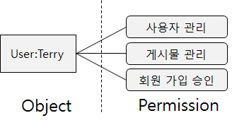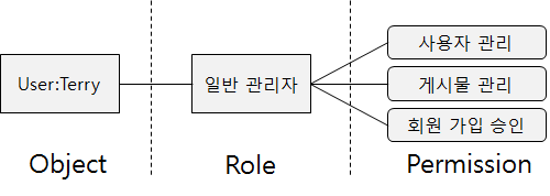 이렇게 권한 부여의 대상이 되는 사용자나 그룹을 Object, 각 개별 권한을 Permission, 사용자의 역할을 Role이라고 정의한다.