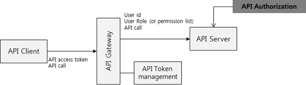 이 경우에는 권한 인가에 필요한 필드들을 API Gateway에서 변환해서 API 서버로 전달해줌으로써 구현을 간략하게 할 수 있는데, 아래 그림과 같이 API 클라이언트가 API Access Token을 이용해서 API를 호출했을 경우, API Gateway가 이 Access Token을 권한 인가에 필요한 사용자 ID, ROLE 등으로 변환해서 API 서버에게 전달해주게 되면, 각 비즈니스 로직은 API 권한 인가에 필요한 사용자 정보등을 별도로 데이터베이스를 뒤지지 않고 이 헤더의 내용만을 이용해서 API 권한 인가 처리를 할 수 있게 된다.