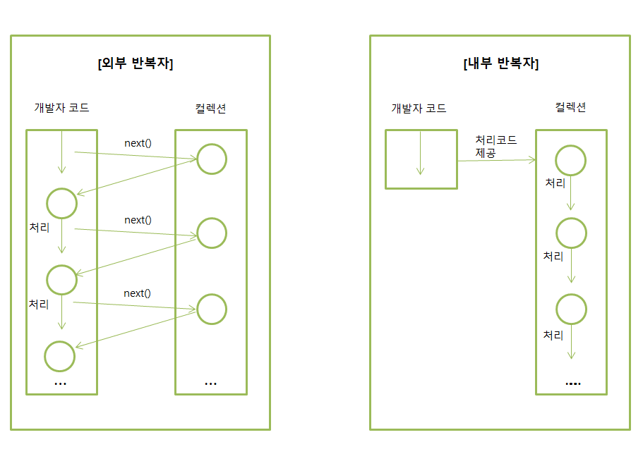 외부 반복자(external iterator) -> 개발자가 코드로 직접 컬렉션의 요소를 반복해서 가져오는 코드 패턴