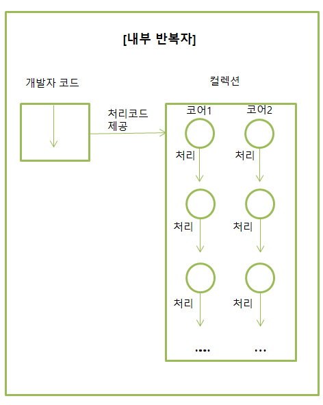 - 내부 반복자는 요소들의 반복 순서를 변경하거나, 멀티 코어 CPU를 최대한 활용하기 위해 요소들을 분배시켜 병렬 작업을 할 수 있게 도와줌