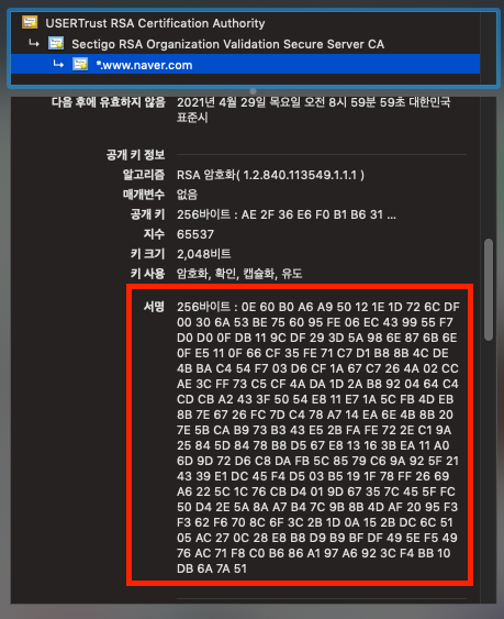 - 발급자의 서명(issuer signing) : naver.com의 인증서를 발행한 인증기관의 디지털 서명
