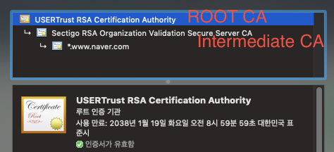 이 인증서 체인을 통하여 최종 인증서(naver.com)는 중계기관(Intermediate CA)가 보증해주며, 중계기관의 인증서는 루트 인증기관(ROOT CA)가 보증해주게 된다. 루트 인증기관은 상위 인증기관이 없기 때문에 셀프 사인(스스로 보증)하게 된다.