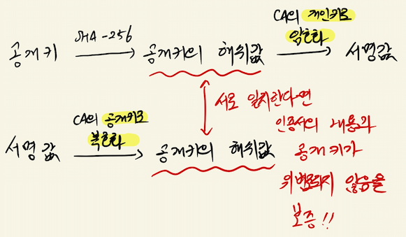 이는 마치 인감도감을 만들어서 동사무소에 인감을 등록하는 과정과 같은데, 인감도장의 내용을 동사무소에 등록하면 동수마소는 이것이 내가 발행한 인감이라는 것을 보증하여 준다. 공개키(인감도장, 인증서) / 인증기관(동사무소, CA)