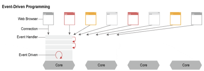 한 개 또는 고정된 프로세스만 생성 하고, 그 프로세스 내부에서 비동기 방식으로 효율적으로 작업을 처리한다. 따라서 동시 접속 요청이 많아도 Process 또는 Thread 생성 비용이 존재하지 않는다.