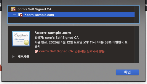 (rootca.crt는 openssl을 이용해서 만든 rootCA의 인증서이며, corn-sample.com.crt는 rootCA의 서명이 들어가 있는 인증서이다.)