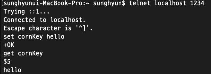 호스트의 1234포트로 연결되었으므로, telnet을 이용해서 접속하면 redis를 사용할 수 있다.