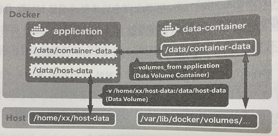 ※ 데이터 볼륨 컨테이너가 직접 볼륨을 다뤄주므로 볼륨을 필요로 하는 컨테이너가 사용할 호스트 디렉터리를 알 필요가 없고 디렉터리를 제공하는 데이터 볼륨 컨테이너만 지정 하면된다. (데이터 볼륨이 데이터 볼륨 컨테이너 안에 캡슐화되므로 호스트에 대해 아는 것이 없어도 데이터 볼륨을 사용할 수 있다.)