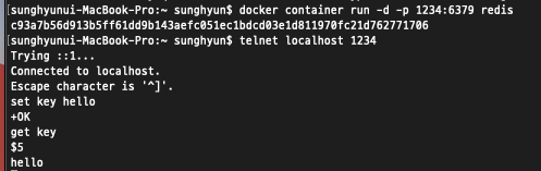 $ docker container run -d -p 1234:6379 redis # redis 이미지를 실행 백그라운드(-d)로 실행