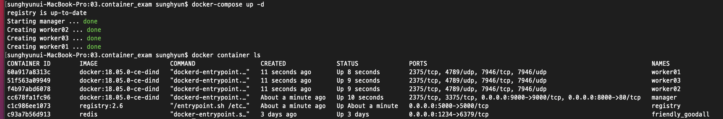 컴포즈를 실행하면 registry 1대, manager 1대, worker 3대, 총 5대 컨테이너가 실행 상태가 된다. 아직은 dind 컨테이너를 여러 대 실행한 상태로, 모든 컨테이너가 서로 협조해 클러스터로 동작하는 상태는 아니다.