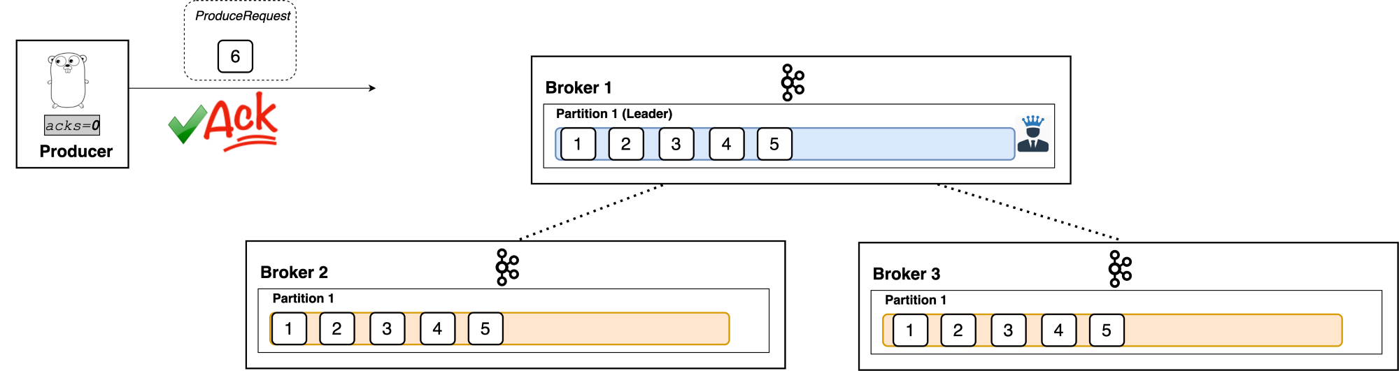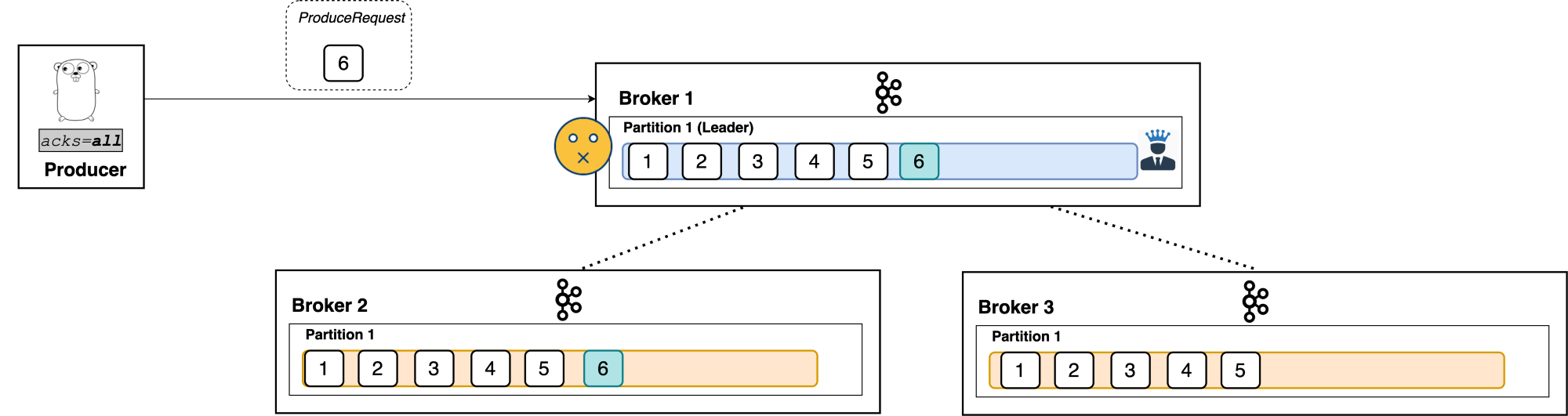 3대의 브로커가 존재하고, 토픽의 리플리케이션 팩터 옵션이 3이라고 가정하자