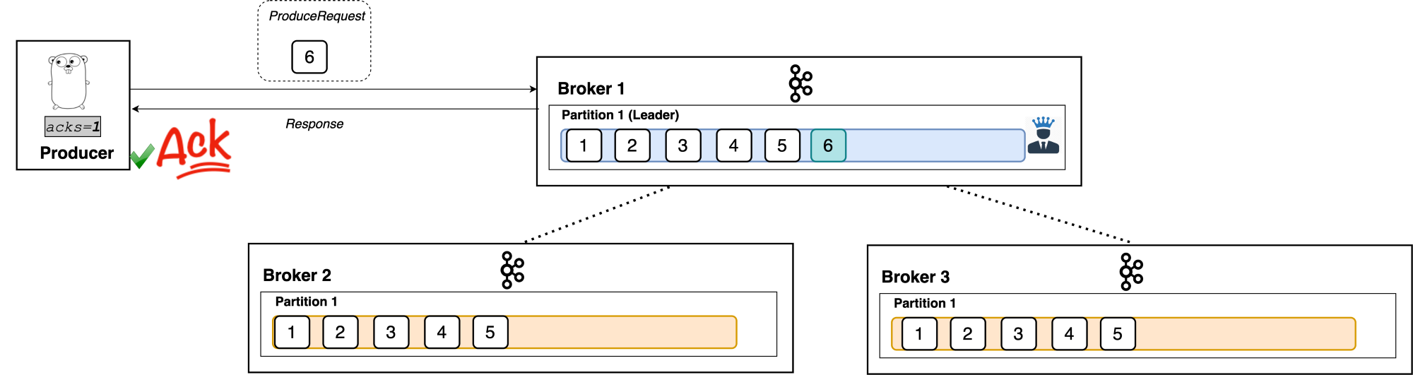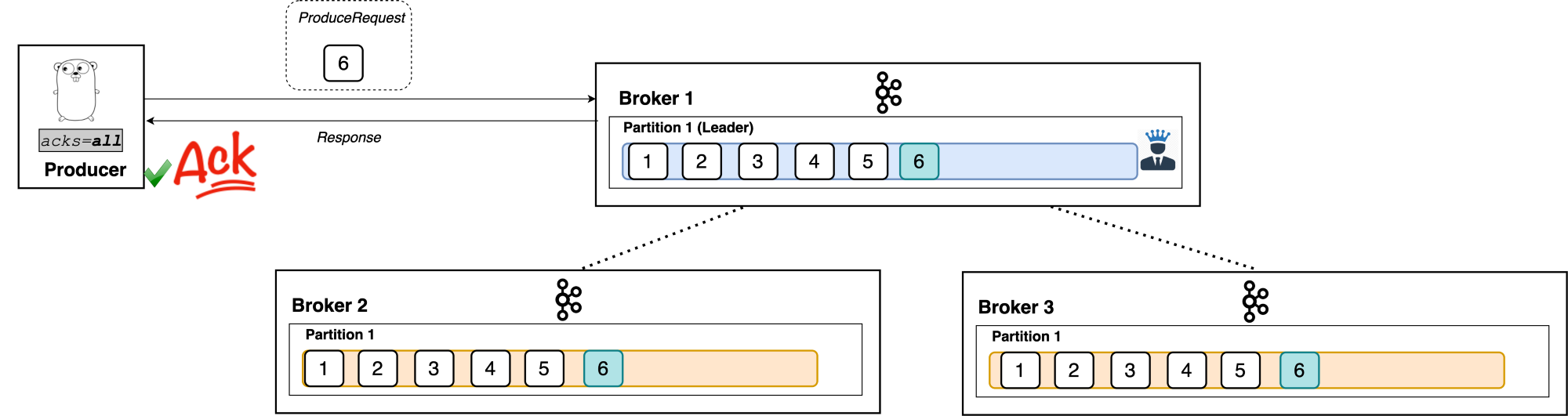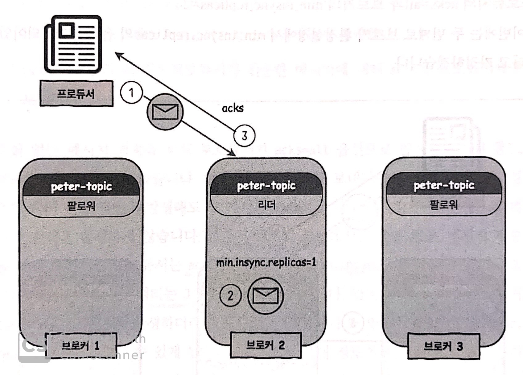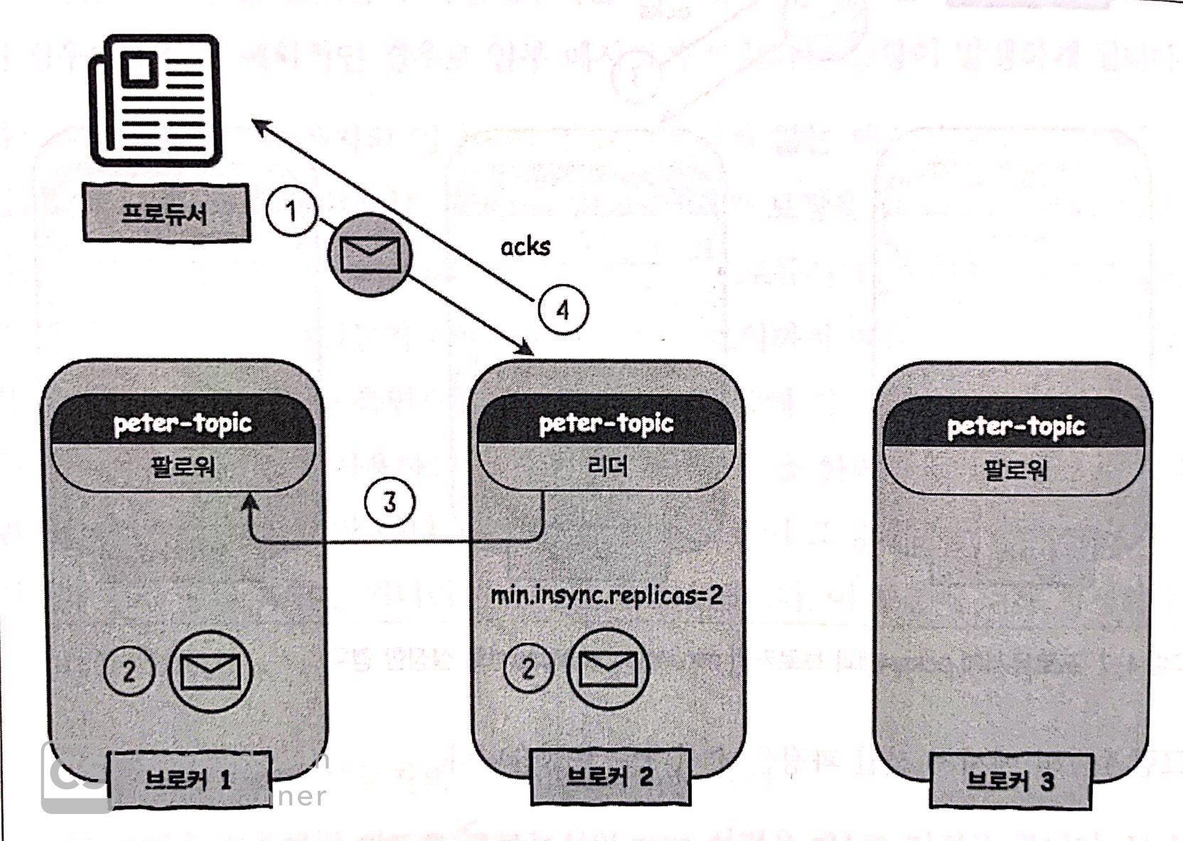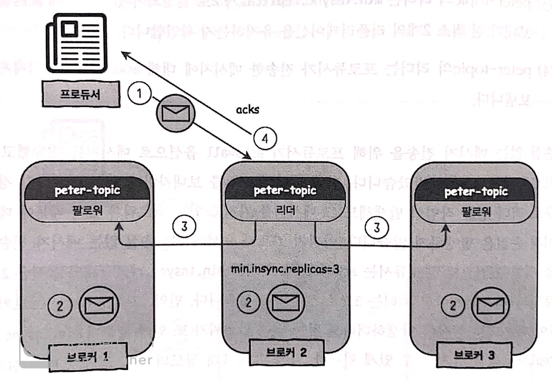 (2) - 리더1 + 팔로워2 총 3 곳에서 모두 메시지를 받고, 리더는 프로듀서에게 메시지를 잘 받았다는 acks를 보냄