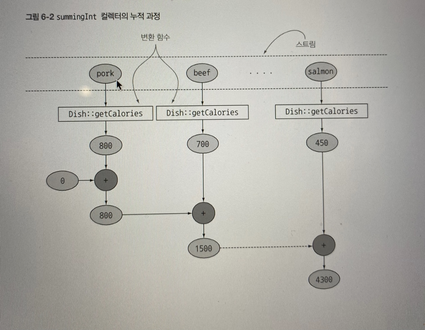 칼로리로 매핑된 각 요리의 값을 탐색하면서 초깃값(여기서는 0)으로 설정되어 있는 누적자에 칼로리를 더한다.