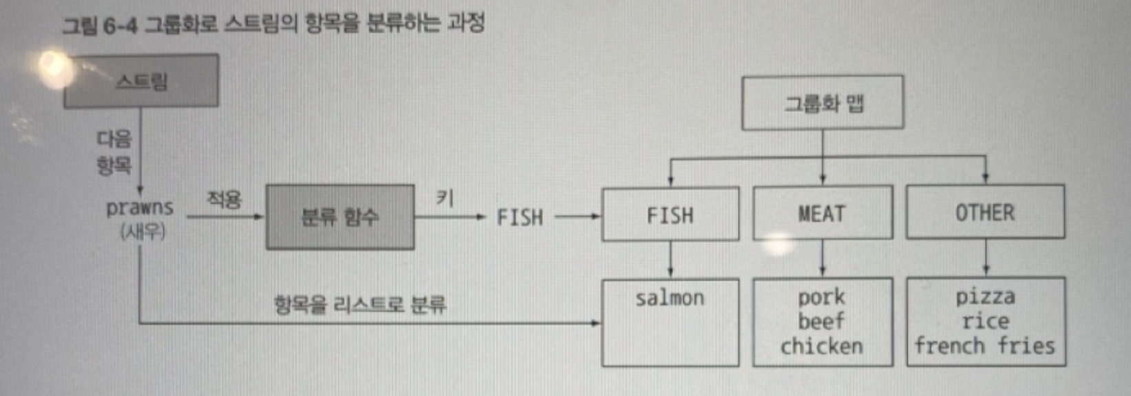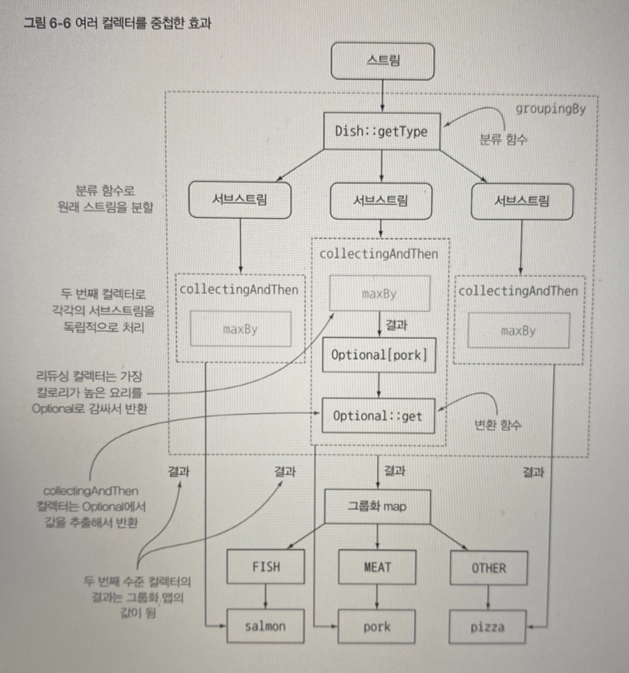- 컬렉터는 점선으로 표시되어 있으며 groupingBy는 가장 바깥쪽에 위치하면서 요리의 종류에 따라 메뉴 스트림을 세 개의 서브스트림으로 그룹화